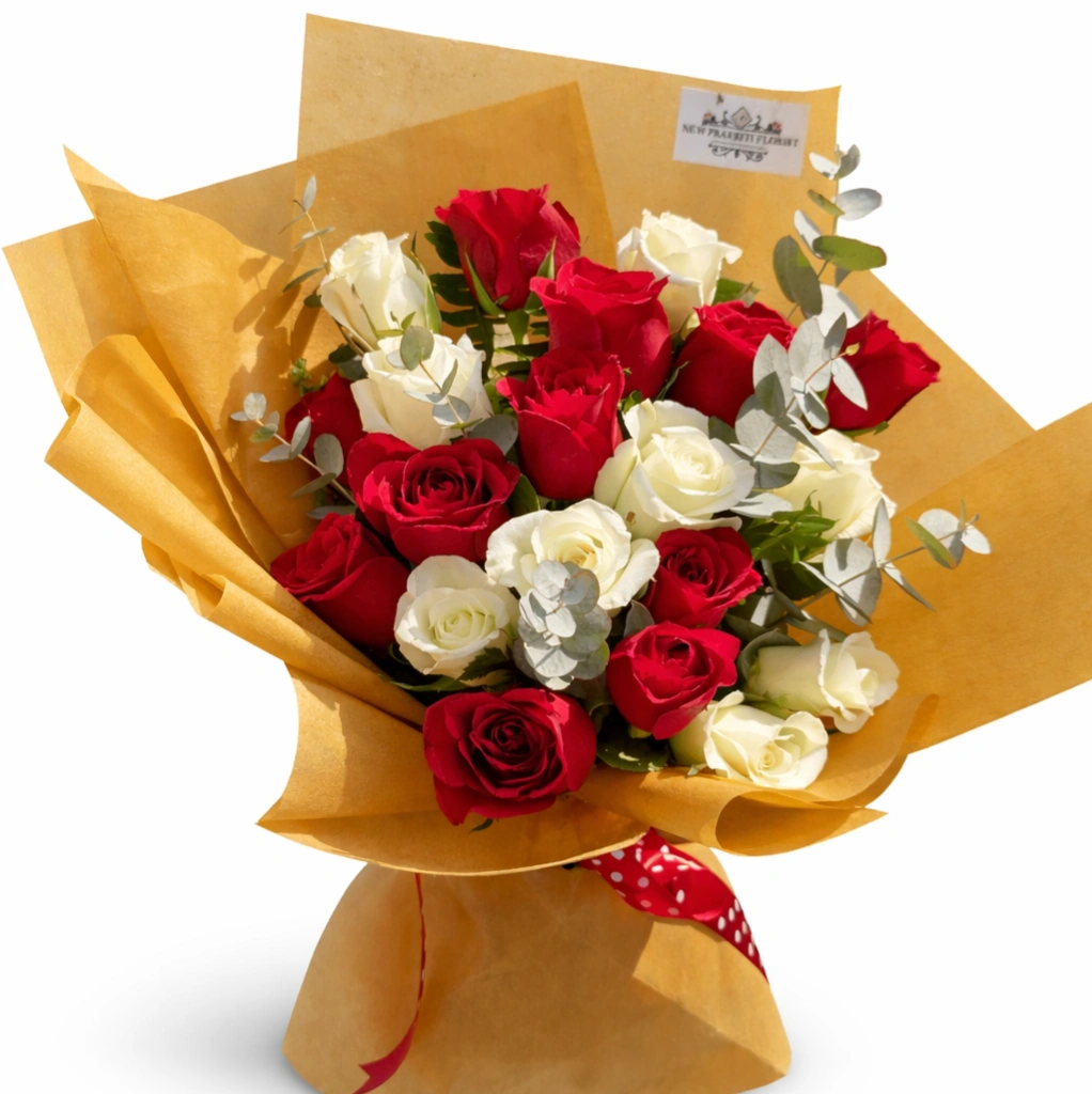 Express love, purity, and heartfelt emotions with our 20 Rose Bouquet featuring a beautiful mix of red and white roses, thoughtfully handcrafted by New Prakriti Florist, one of the most trusted and best flower stores in Kathmandu.